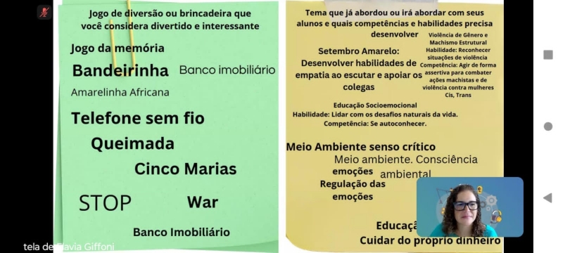 No dia 09/09, segunda-feira, as educadoras Andréia e Magda participaram do 5° encontro/4° aula da Formação para o Projeto Educomunicação em Ação Social, Módulo II - Gamificação e Cultura Maker com a professora Flávia Giffoni. Abordando os temas “O Jogo Pedagógico ou Educativo” e “Técnicas de Aplicação” através da interação em pares para socialização e construção de atividades com os jogos de diversão, adaptando-os para o contexto pedagógico dentro dos quatro pilares: Meta, Dinâmica, Mecânica e Elementos. Aula esta, dinâmica e envolvente possibilitando uma melhor compreensão dos contextos abordados nas atividades.