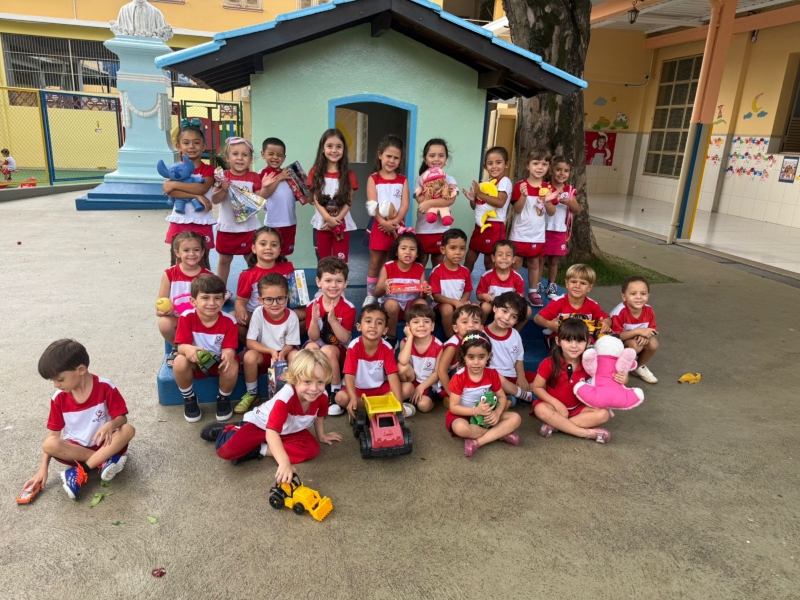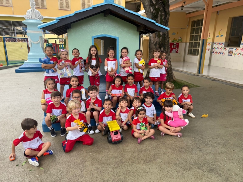 Cada criança trouxe um brinquedo para trocar com os colegas, vivenciando, na prática, valores importantes como compartilhar, desapegar e respeitar o que é do outro.